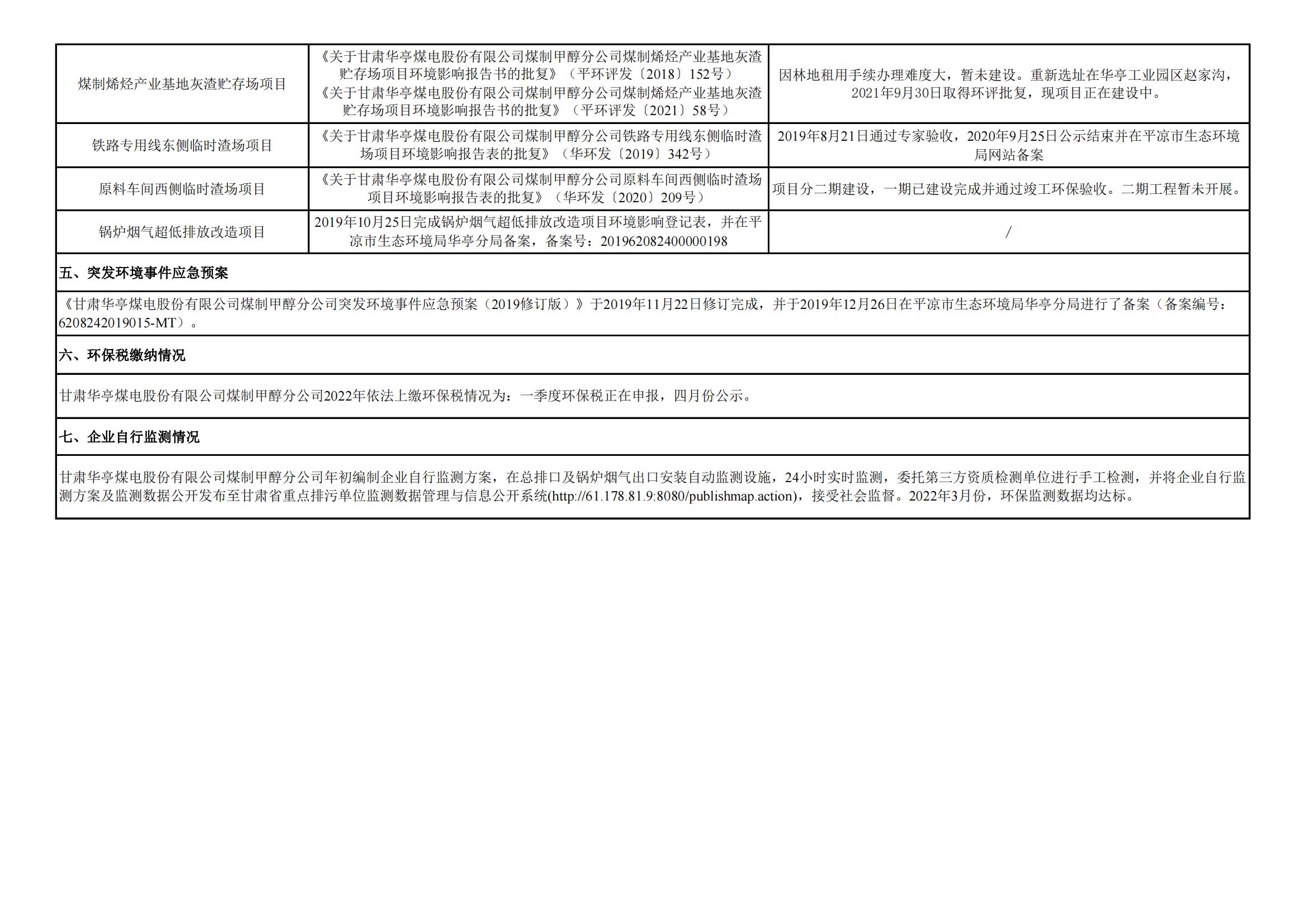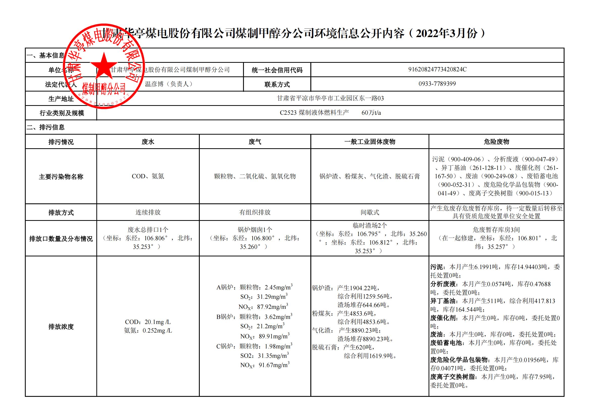 煤制甲醇分公司環(huán)境信息公開內(nèi)容(2022年3月)